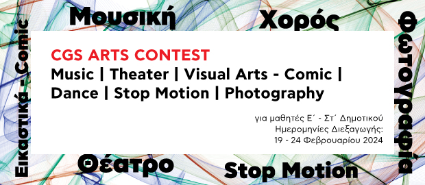 Ο Διαγωνισμός CGS ARTS CONTEST διοργανώνεται από το τμήμα ARTS του Δημοτικού και τους επαγγελματίες εκπαιδευτικούς του, στο πλαίσιο της αειφορίας και της καλλιέργειας των δεξιοτήτων του 21ου αιώνα με την υποστήριξη της διεύθυνσης του Δημοτικού και της κ. Ζωής Γείτονα.