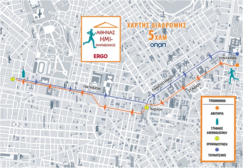 Αφετηρία: Η εκκίνηση του Αγώνα Δρόμου 5χλμ δίνεται στην οδό Φιλελλήνων στην Πλατεία Συντάγματος, στο ύψος της Οδού Ερμού, με κατεύθυνση προς την Οδό Σταδίου.