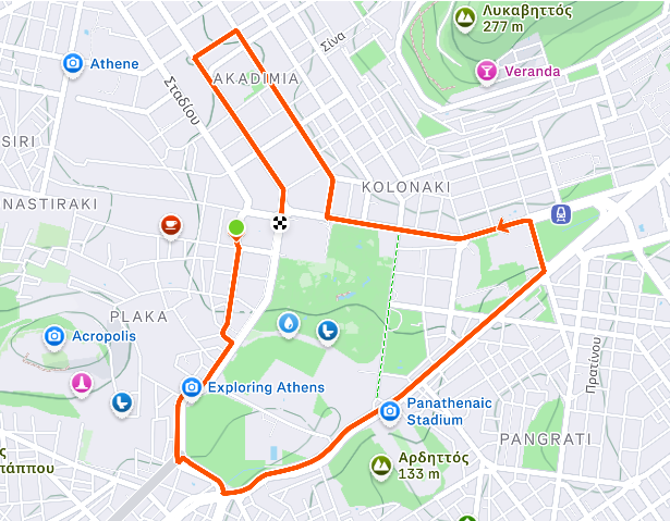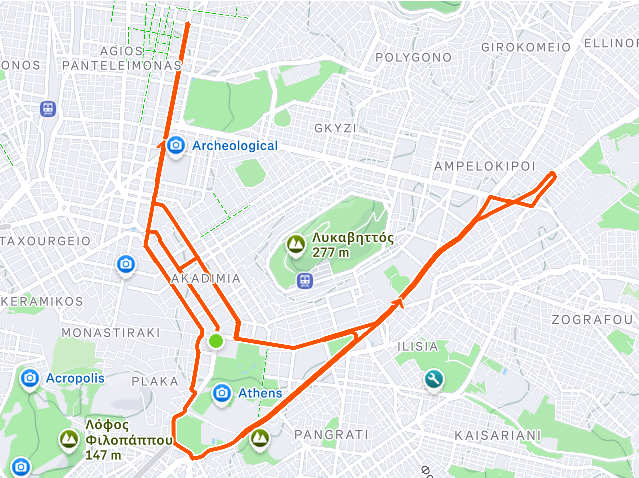 Διαδρομή: Βασιλίσσης Αμαλίας στο ύψος του Αγνώστου Στρατιώτη – Πανεπιστημίου – Αριστερά στην Αιόλου – Αριστερά στη Σταδίου – Φιλελλήνων – Δεξιά στην Βασιλίσσης Αμαλίας – στο ύψος Βασιλίσσης Όλγας συνεχίζουμε στην Βασιλίσσης Αμαλίας αντίθετα στα οχήματα (άνοδος) – Αριστερά στην Αθανασίου Διάκου αντίθετα στα οχήματα (άνοδος) – Αρδηττού αριστερά αντίθετα στα οχήματα (άνοδος) – στο ύψος Βασιλίσσης Όλγας κατευθυνόμαστε Δεξιά στο ρεύμα ανόδου της Βασιλέως Κωνσταντίνου – συνεχίζουμε στην Βασιλίσσης Σοφίας – στρίβουμε Δεξιά στην Λεωφόρο Μεσογείων – Δεξιά στην Φειδιππίδου – Αριστερά στην Μιχαλακοπούλου – Αριστερά στη Λεωφόρο Μεσογείων και κινούμαστε στη μεσαία λωρίδα προς Φειδιππίδου – Δεξιά στην Φειδιππίδου – στον κόμβο της Λεωφόρου Αλεξάνδρας στρίβουμε Αριστερά στην Βασιλίσσης Σοφίας (στο ρεύμα της καθόδου) – στον κόμβο HILTON περνάμε πίσω από τον δρομέα συνεχίζοντας στην Βασιλίσσης Σοφίας – στρίβουμε Δεξιά στην Ακαδημίας – Αριστερά στην Χαλκοκονδύλη – Δεξιά στην Λεωφόρο Πατησίων με κατεύθυνση προς Λεωφόρο Αλεξάνδρας (ρεύμα ανόδου)– Αναστρέφουμε Αριστερά στην Κεφαλληνίας με κατεύθυνση προς Πλατεία Ομονοίας – Αριστερά στην Αιόλου– Αριστερά στη Σταδίου – Φιλελλήνων – Δεξιά στην Βασιλίσσης Αμαλίας – στο ύψος Βασιλίσσης Όλγας συνεχίζουμε στην Βασιλίσσης Αμαλίας αντίθετα στα οχήματα (άνοδος) – Αριστερά στην Αθανασίου Διάκου αντίθετα στα οχήματα (άνοδος) – Αρδηττού αριστερά αντίθετα στα οχήματα (άνοδος) – στο ύψος Βασιλίσσης Όλγας κατευθυνόμαστε ευθεία στο ρεύμα της καθόδου στη Βασιλέως Κωνσταντίνου – στον κόμβο του HILTON στρίβουμε αριστερά στην Βασιλίσσης Σοφίας στο ρεύμα ανόδου με κατεύθυνση προς Σύνταγμα ( αριστερό ρεύμα) – Δεξιά στην Ακαδημίας (αριστερή πλευρά) – Αριστερά στην Ιπποκράτους – Αριστερά στην Πανεπιστημίου – τερματισμός στην Βασιλίσσης Αμαλίας στο ύψος του Μνημείου του Αγνώστου Στρατιώτη.